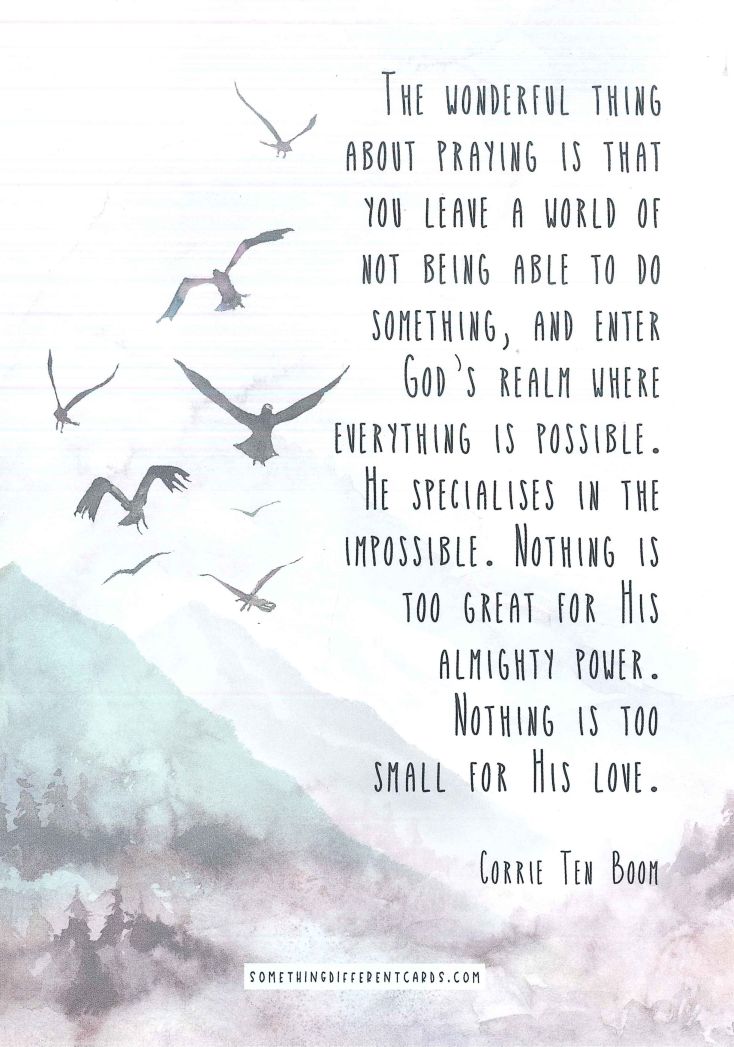 Side 2: The wonderful thing about praying is that you leave a world of not being able to do something, and enter God’s realm where everything is possible. He specialises in the impossible. Nothing is too great for His almighty power. Nothing is too small for His love. Corrie Ten Boom.