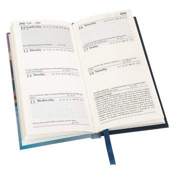 Quality slimline diary appointment calendar for 2024 with marker ribbon. Each week starts with the Lord’s Day. Week-to-view with Scripture text per day, daily Bible reading plan and weekly footnote for interest and prayer.